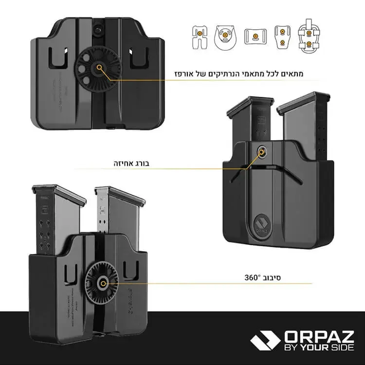 פתרון מקצועי לנשיאת שתי מחסניות אקדח בצורה מאובטחת ונגישה. הפונדה הכפולה של אורפז מציעה עמידות פולימרית גבוהה לצד נוחות נשיאה מקסימלית בזכות מתאם פאדל ארגונומי המחלק את המשקל בצורה שווה על המותן. הפונדה מאפשרת כיוונון אישי של זווית הנשיאה ולחץ האחיזה בכל מחסנית, מה שמבטיח מוכנות מלאה ושליפה מהירה ברגע האמת.